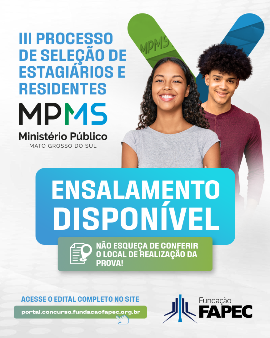 A Fundação de Apoio à Pesquisa, ao Ensino e à Cultura (Fapec), banca organizadora do III Processo Seletivo de Estagiários e Residentes do Ministério Público do Estado de Mato Grosso do Sul (MPMS), publicou nesta semana o Edital nº 8/2026, convocando os candidatos inscritos para as Provas Objetivas e Provas Discursivas.